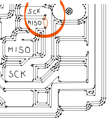 But while soldering the board, I noticed that the SCK and MISO pins were connected. It wasn't a problem with the Eagle file, but with the milling. The Roland couldn't mill those trace.