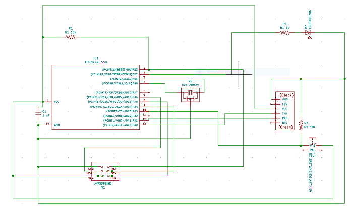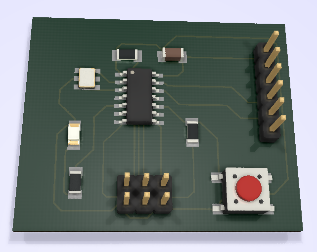 So, for this task, we received an explanation about the basics of designing and making this kind of devices. Based on electronics production week programer and the echo hello-world board, I learned that the common “formula” to design around this kind of micro-controllers in PCBs always include a 1 uF capacitor between GND and VCC (for voltage decoupling) and a 10 k resistance between Reset and VCC (to avoid uncontrolled resets of the microcontroller).