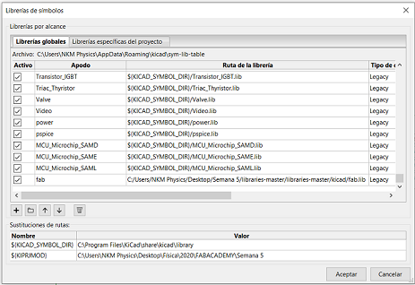 Once the library has been downloaded, go to the preferences tab and select the “Manage Symbol Libraries” option, select the “Fab” one in the global libraries list, this is going to be needed to assign the footprints to each symbol included (this has to be done only the first time working with the software).