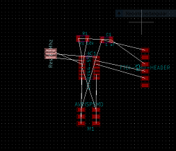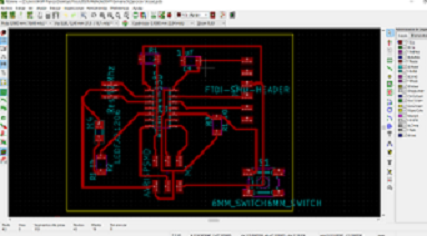 The drawing of a board starts with the schematics. Select the “Schematic Layout Editor”, there you can add the symbols for each component. For this example, we added an Attiny44, capacitors, resistors, a 20Mhz resonator, an LED, a button switch, and finally, FTDI and AVRISP connection pins. Once that all the components are included to the schematic, we started making all corresponding connections between all of them.