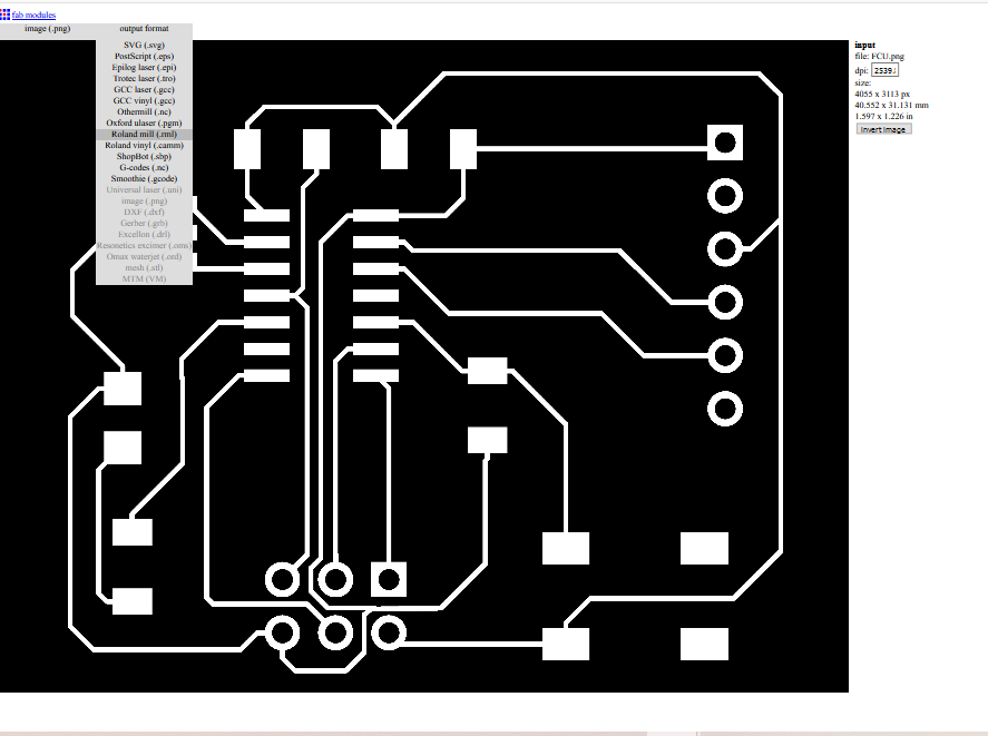 As seen on the electronics production week assignment documentation, you must import the .png file in Fab Modules, click the insert image button, in the output format select Roland mill (.rml), then select the process based on the tool that you will use, check the values and click calculate, save it, and that file can now be used to send it to the machine using the cut button on V Panel software.