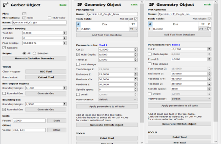 As I didn’t know the workflow for other kind of machines (such as the Monofab SRM 20), I tried exporting to SVG files, used Inkscape to save a .png file, and then configured that on Fab Modules. The .svg files must be modified a little bit, grouping all the objects, adjusting the page size to the content on the editing tab. It is also very important to modify the resolution of the image to a higher value to ensure the image accuracy order to be well interpreted by the Fab Modules.