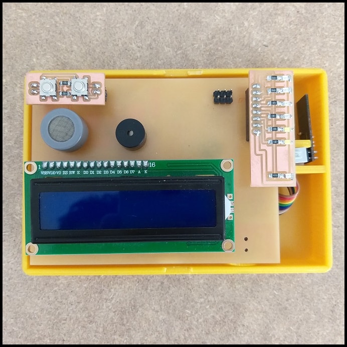 The cover has cuts for the LCD, CO sensor, buzzer, control push buttons and LED module. It fits the height of components inside. I used Eagle PCB file to get the right position of each component reference to board boundaries.
