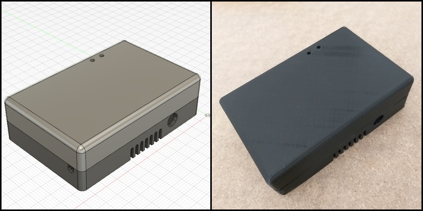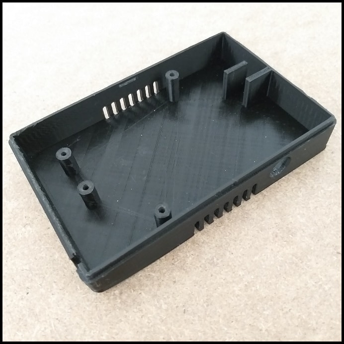 The base has extrudes with 3 mm holes where M3 screws are used to fix the board and the 4-pos terminal block. A special extrudes also added to keep the NRF24L01+ wireless module in place. It also has cuts for power jack and ventilation. I exported a dxf file from Eagle for board boundaries and hole positions, and used in Fusion 360 to build the base.