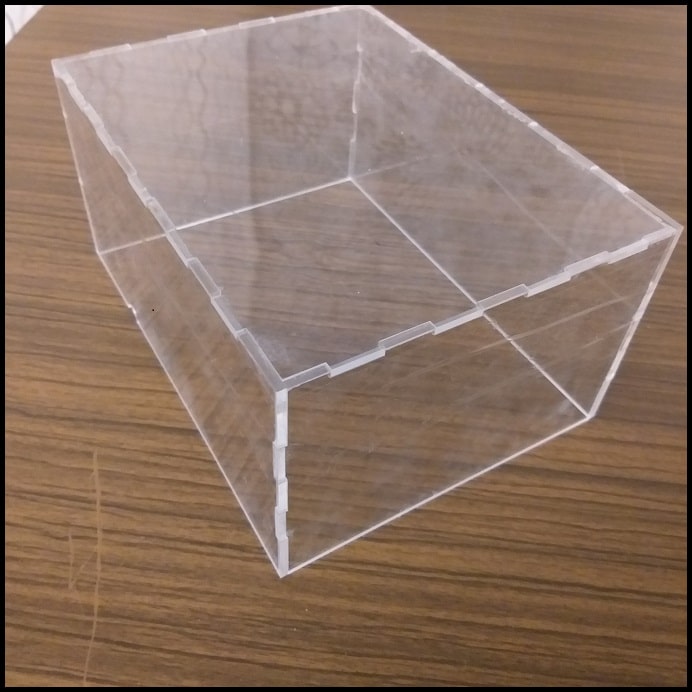 The test chamber is made using laser cutting and 3 mm transparent acrylic. It is used to test the system by creating a closed chamber where CO levels are raised by burning cotton soaked with liquid fuel. The chamber dimensions are W x D x H = 200 mm x 150 mm x 100 mm.