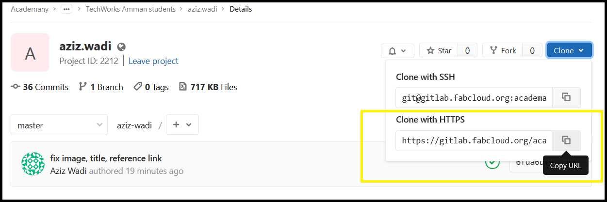 Step2: From my account in fabcloud in gitlab, I copied the source URL to clone with HTTPS.