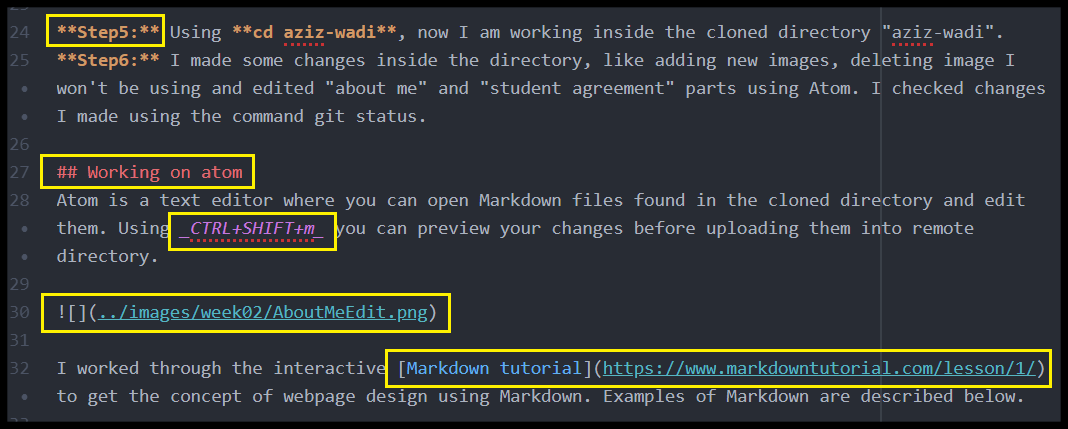 Step6: I made some changes inside the directory, like adding new images, deleting image I won’t be using and edited “about me” and “student agreement” parts using Atom. I checked changes I made using the command git status.