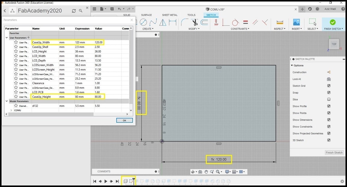 Cover width and height were saved as parameters in Fusion 360. If the size of the cover is to be changed, this can be achieved by changing height and width values in parameters.
