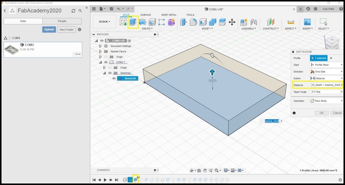 Step 2: Using “Extrude” command, the base sketch was extruded to fit inside the LCD. Extrude height is defined as a function of LCD height and shell or thickness value of the cover. Both values are defined as parameters. The extruded body was saved as a new body inside the component created in step 1.