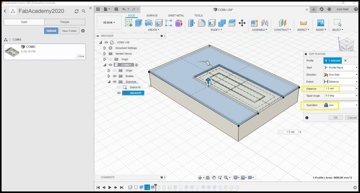 Step 4: Using “Extrude” command, the region was extruded 1.5 mm up. New material was joined to the existing model, so no new body was created.