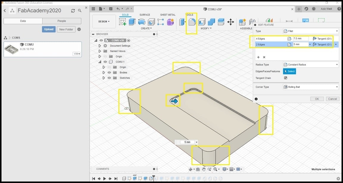 Step 5: Using “Fillet” command, outside body corners were rounded by 7.5 mm (4 edges), and the corners where the LCD were rounded by 5 mm (two edges).