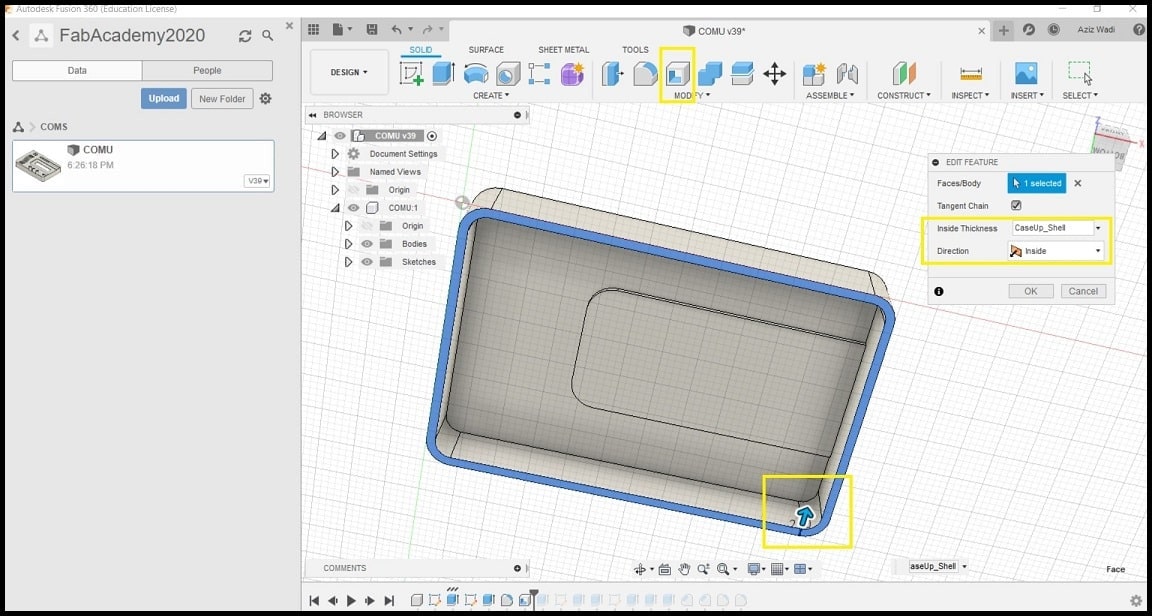 Step 6: Using “Shell” command, the upper case body was shelled from the bottom surface. It was important to make the 1.5 mm extrude and fillets before the shell so they would be included in the final shape. The thickness of shell was defined in parameters table.