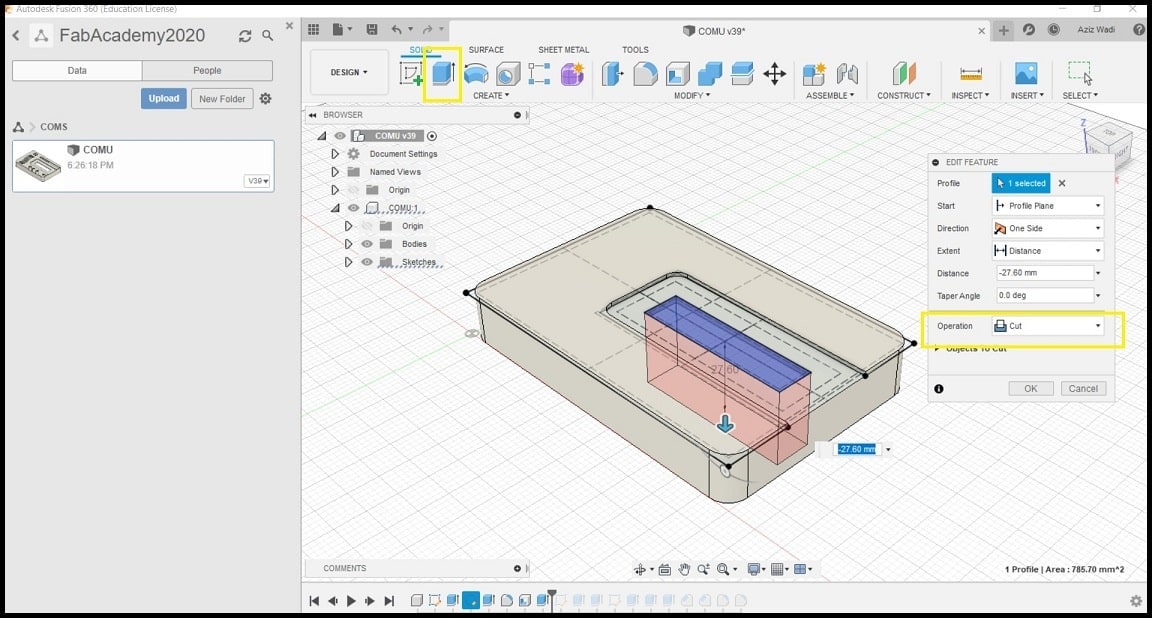 Step 7: Using “Extrude” command and the sketch created in step 3, a cut was made for the LCD screen. The size of the rectangle was defined in parameters.
