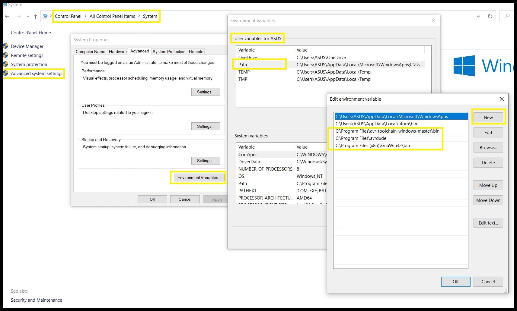 Step 4: Open Control Panel > System > Advanced System Settings > Environment Variables and in “User Variables” section select “Path” and click on “Edit”. For each path listed below click on “New” and add it to the list.
