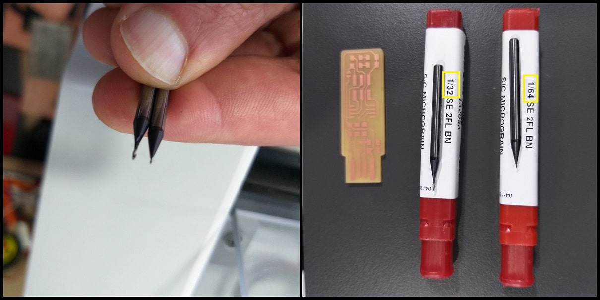 We used two milling bits; for traces 1/64” (0.4 mm), and for interiors 1/32” bit (0.8 mm).