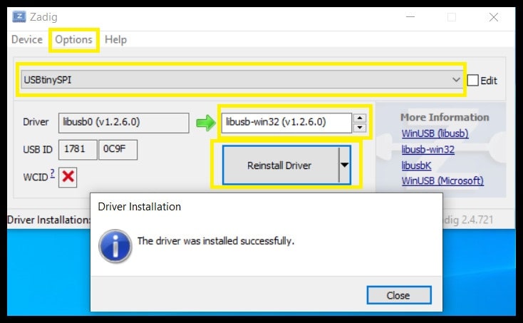 Step 5: Downlaod “Zadig” and run it. Insert the programmer into USB and go to Zadig > Options > List All Devices. Select “USBtinySPI” from the dropdown list and select “libusb-win32 (v1.2.6.0)” in the target driver side. Click on “Install Driver”
