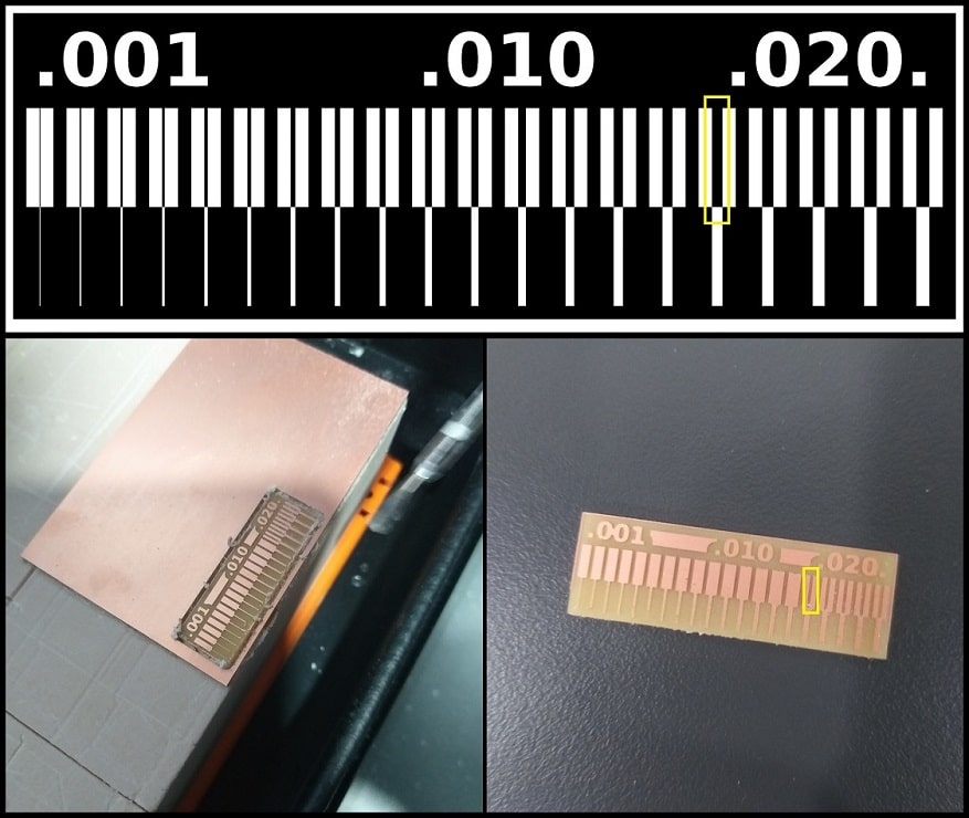 The milling bit used for traces (1/64”) couldn’t complete traces less than 0.016”. This is expected, since the size of the milling bit is 0.0156” (1/64”), it cannot be used to complete trace width less than that value.