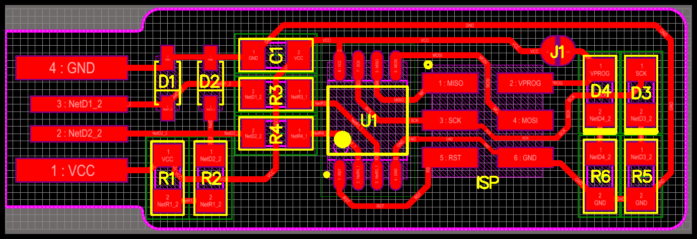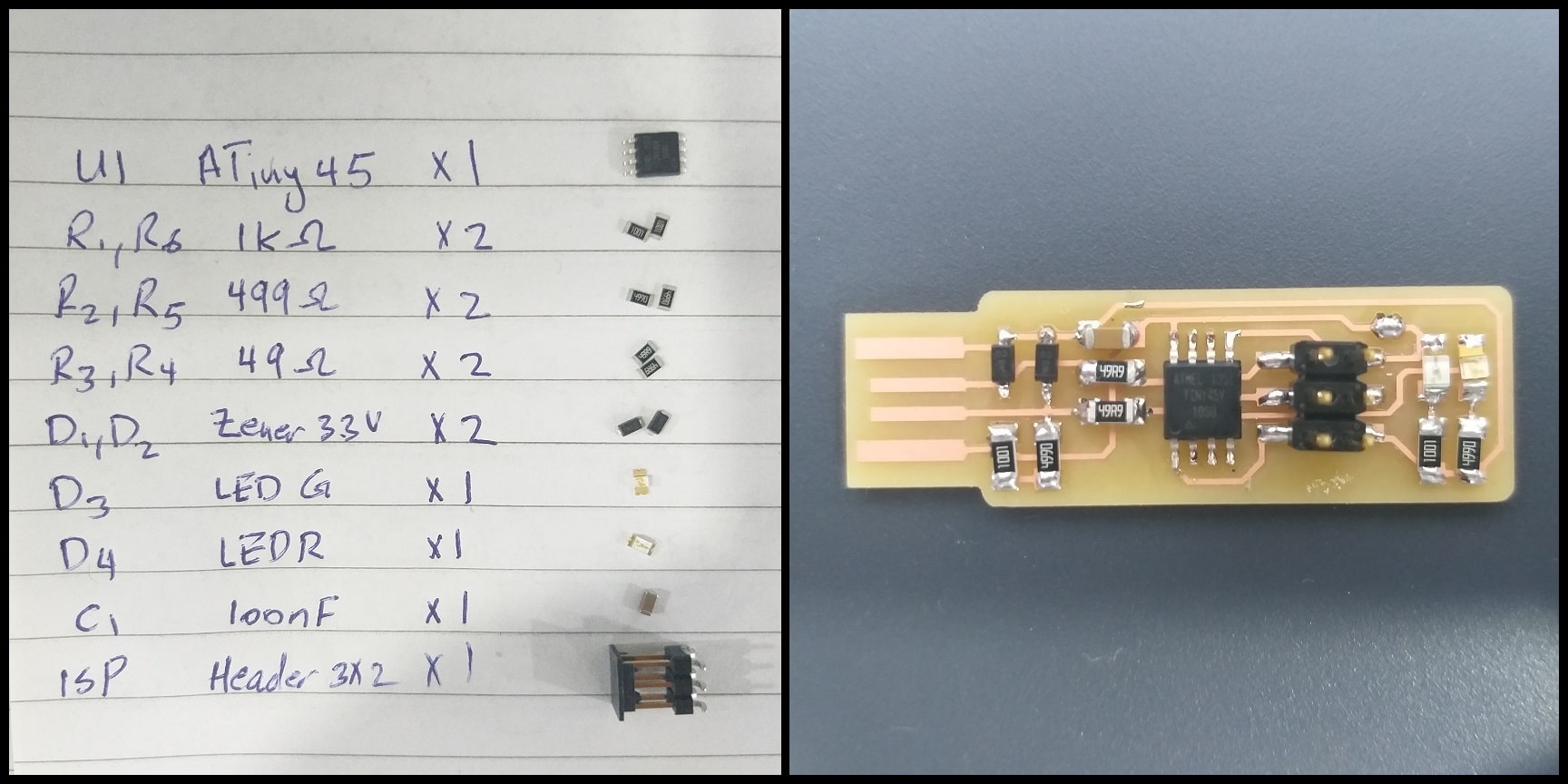 Using component references and board image below, I completed soldering the ISP. I started with the inner component (ATtiny45) and moved out working on small components first.