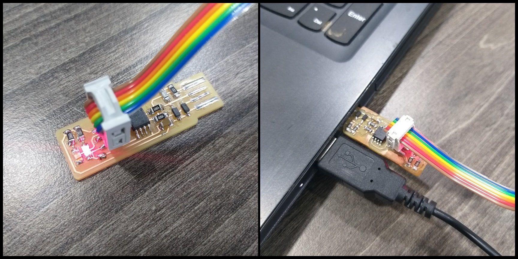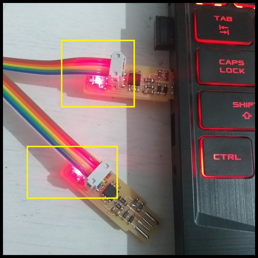 To program the board I used another FabTiny ISP that was already programmed. Image to the left shows the FabTiny ISP target board, and to the right shows the programmer used.