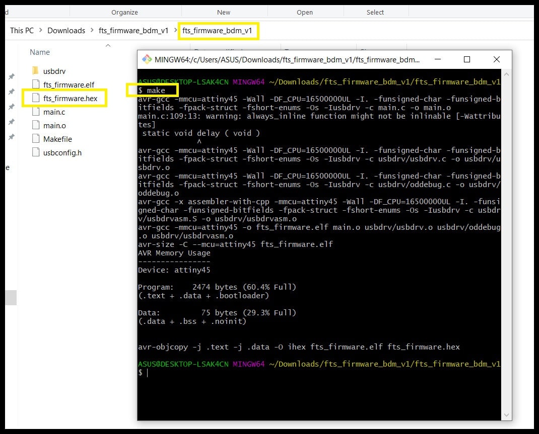 Step 2: In “Git Bash” command window run “make”. This will generate “fts_firmware.hex” file, which will be programmed to the target FabTiny ISP. Note that the default programmer defined in “Makefile” is the “usbtiny”. You can check that by opening the “Makefile” and look for “PROGRAMMER ?= usbtiny”. If you are using another programmer you have to change here (use Notepad++).