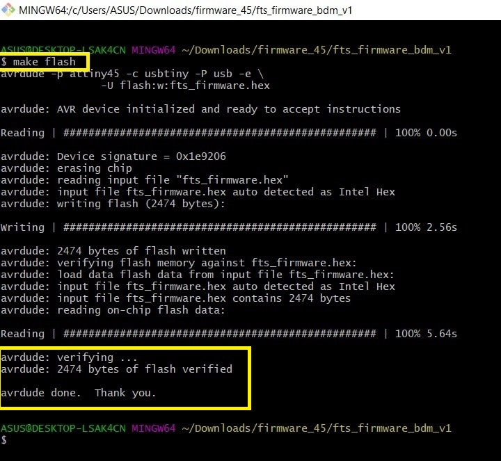 Step 4: In “Git Bash” command window run “make flash”. This command will program the flash memory in target board with the file “fts_firmware.hex”.