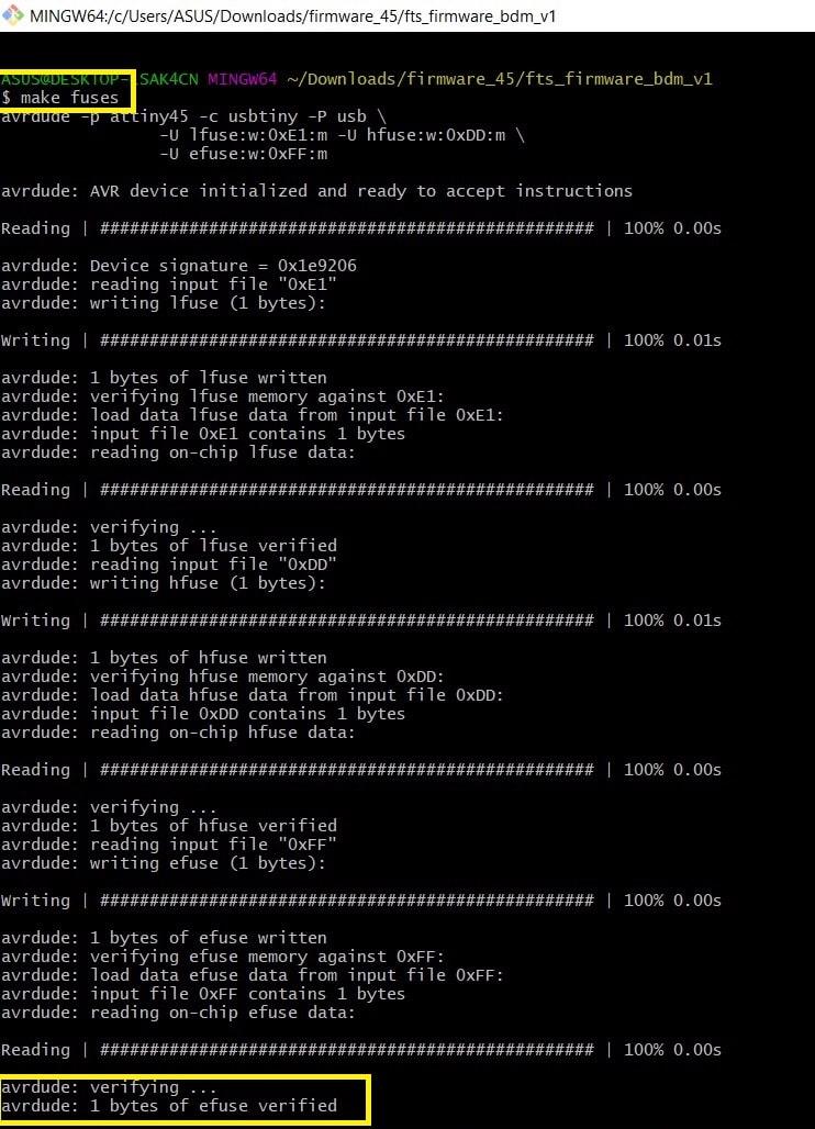 Step 5: In “Git Bash” command window run “make fuses”. This command will program some settings to make the FabTiny ISP target board a programmer.