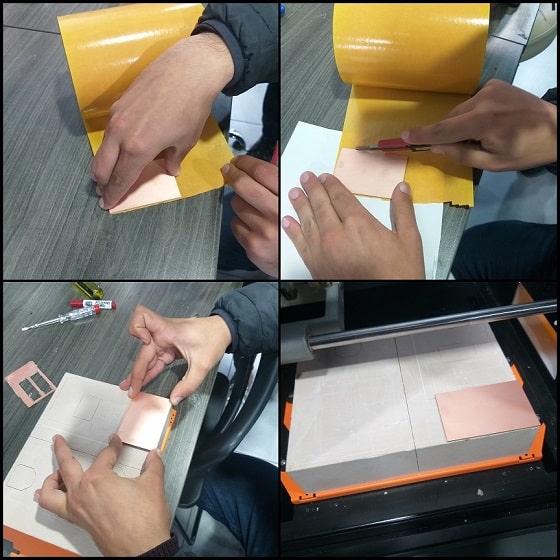 We used FR4 single layer PCB (laminate thickness = 1.2 mm, copper base thickness 0.1 mm). Using a utility knife, cut a piece little larger than the size of your design. Fix the cut piece on a thin double face tape and cut around it. Remove the lower paper of the double face and fix the board on the high density foam used in the machine.