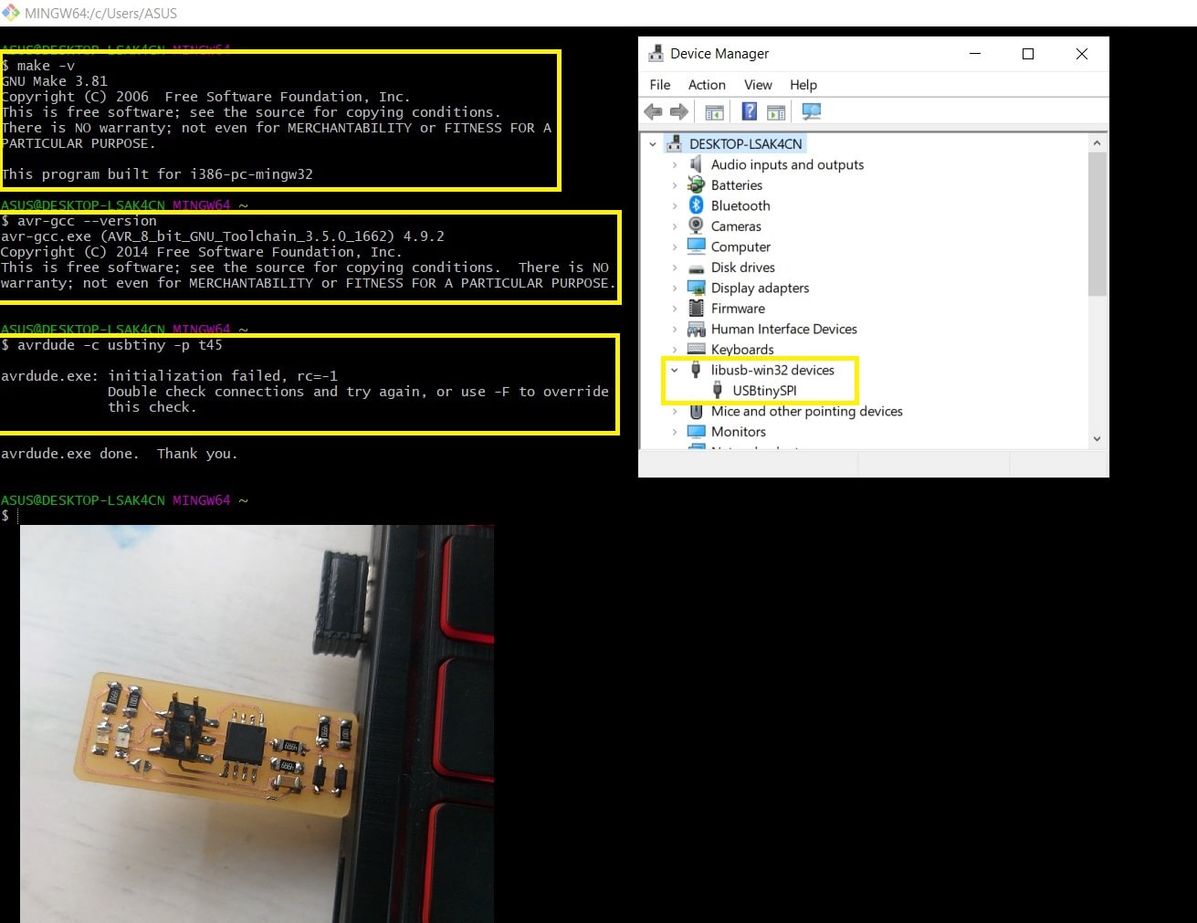 Step 6: To check your tools and drivers, start “Git Bash” and run the commands “make -v”, “avr-gcc –version” and “avrdude -c usbtiny -p t45”, if you see the same response in command then you are good. Also, check that the programmer is listed it “Device Manager”.