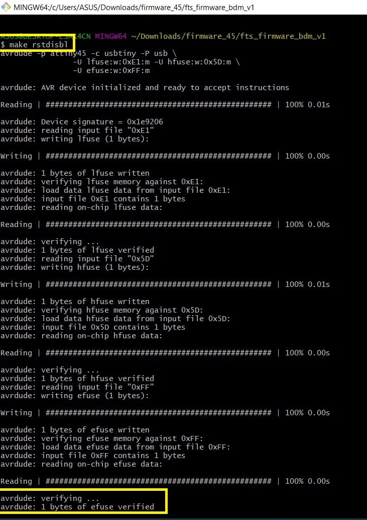 Step 7: Unplug the FabTiny ISP target board and insert the programmer to USB. Connect the 3x2 headers in both boards. In “Git Bash” command window run “make rstdisbl”. This command will disable reprogramming the FabTiny ISP in future.