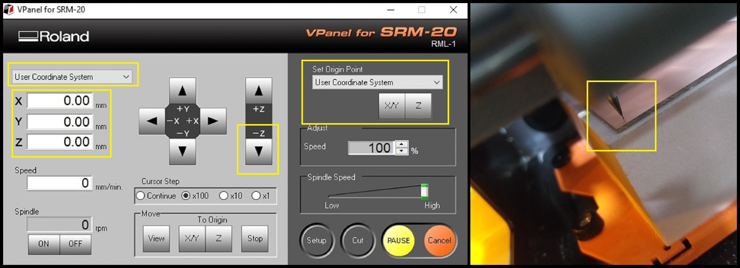 Step 4: From the “Set Origin Point” dropdown menu to the right, make sure to select “User Coordinate System”. Click on “XY” and “Z”. This will define the current position as the home or zero position in the user coordinate system. Select “User Coordinate System” from the dropdown menu to the left. The values of “X”, “Y”, “Z” should be zeros.