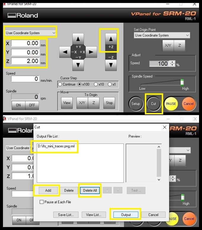 Step 6: Click on “Cut” and click on “Delete All” to remove any old jobs. Click on “Add” and select the traces rml file. Click on “Output”. The machine should start now.