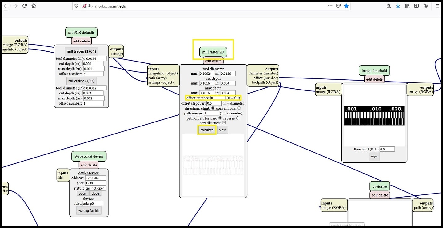 Step 5: In “mill raster 2D” block, change settings as your requirements. I changed “offset number” to 0 so all copper will be milled out and only traces will be left. Click on calculate and when the program finishes a dialog box will appear and ask you to save the file locally.
