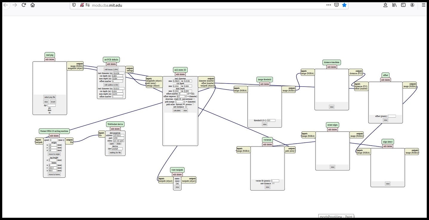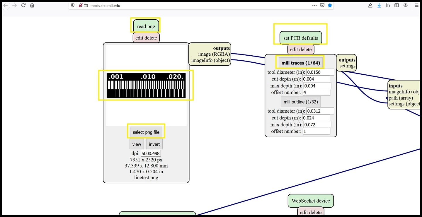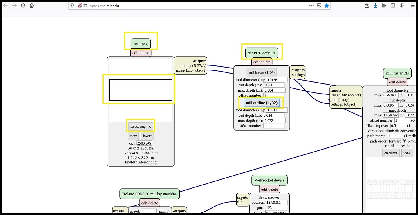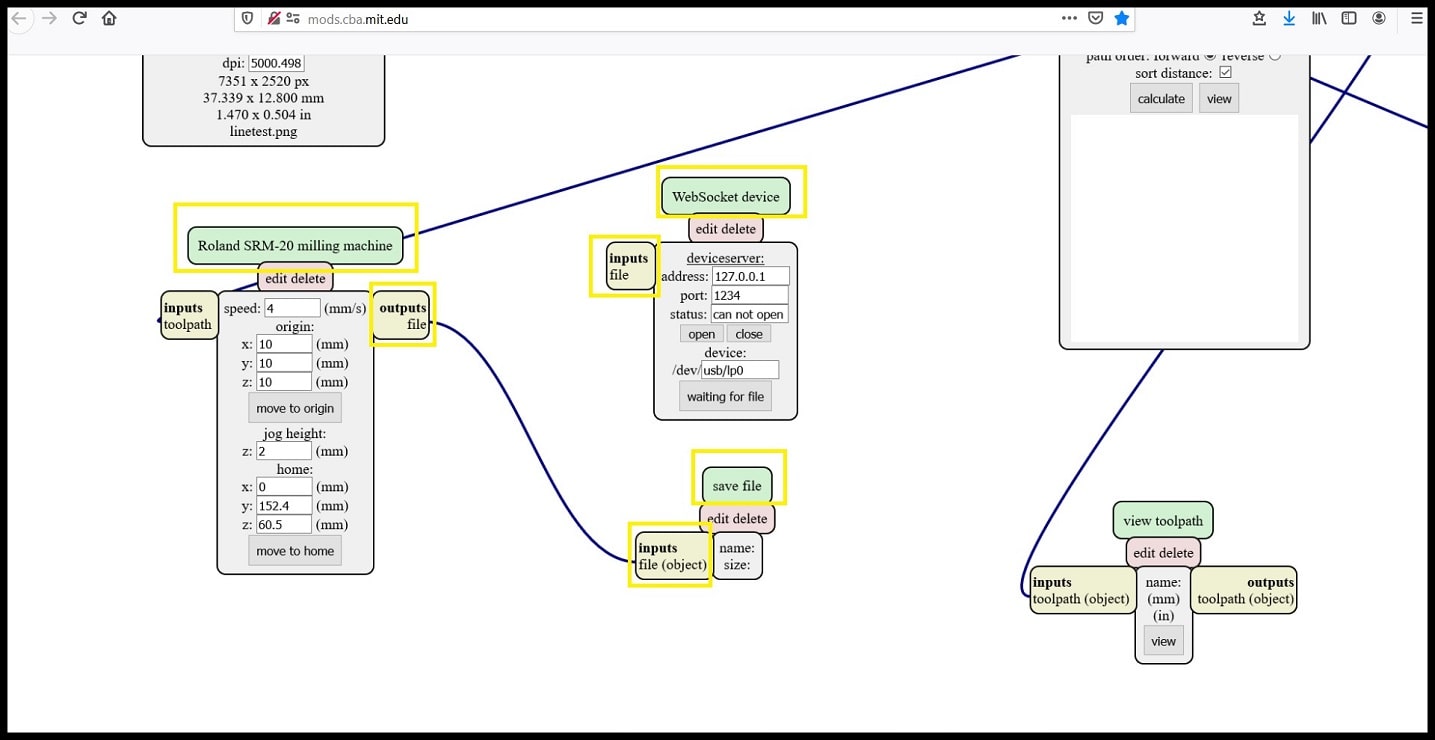 Step 4: The program is designed to communicate with the machine if operated in LINUX OS. The final output of the program will be sent to “WebSocket device”. I made a change and fed the output into “save file” module, so the rml file will be save locally and then used on the milling machine software.