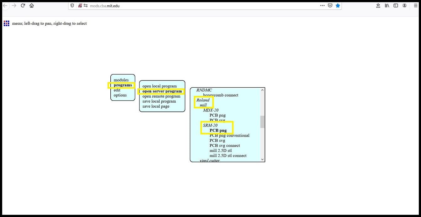 Step 1: Open mods and right click to open the selection list. Click on programs > open server program > machines > Roland > mill > SRM - 20 > PCB png.