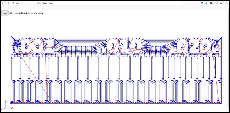 Step 8: In “mill raster 2D” block, click on calculate and when the program finishes a dialog box will appear and ask you to save the file locally. The image below shows the result tool path for interiors file.