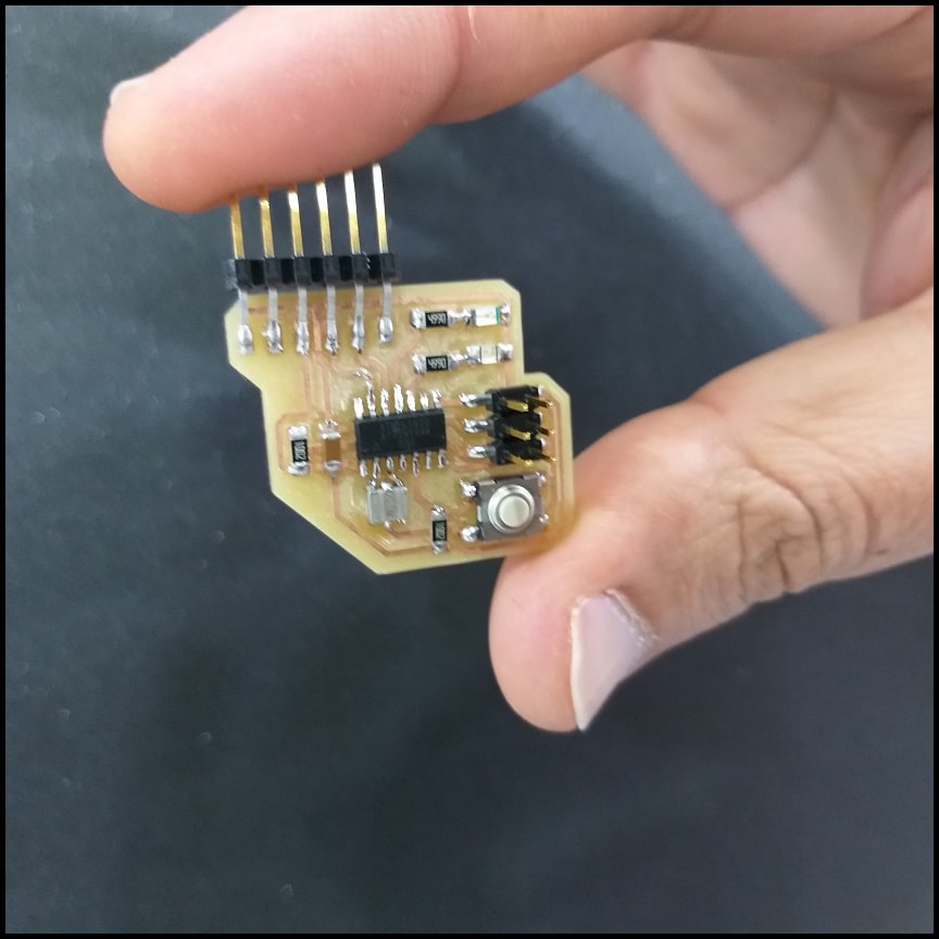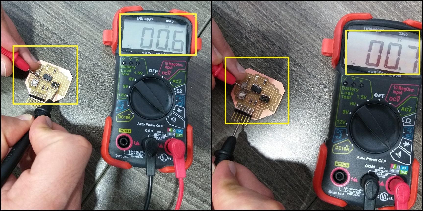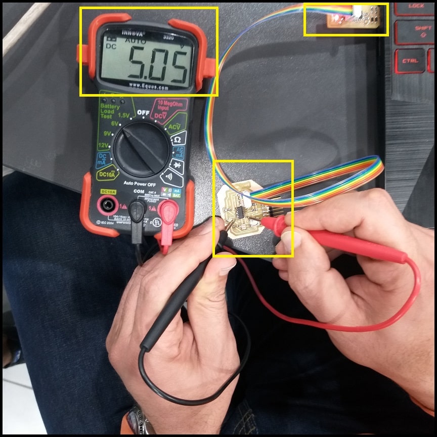 We connected the board to the FabTiny programmer and then to USB. We measured the voltage between the VCC pin and GND pin. The digital multimeter read 5V, which is the USB port voltage.