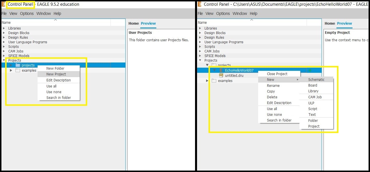 Step 1: Open Eagle software. This is the “Control Panel”. Right click on “Projects” and then select “New Project” and name it. I called mine “EchoHelloWorld07”. This will be the container for the schematic and PCB.