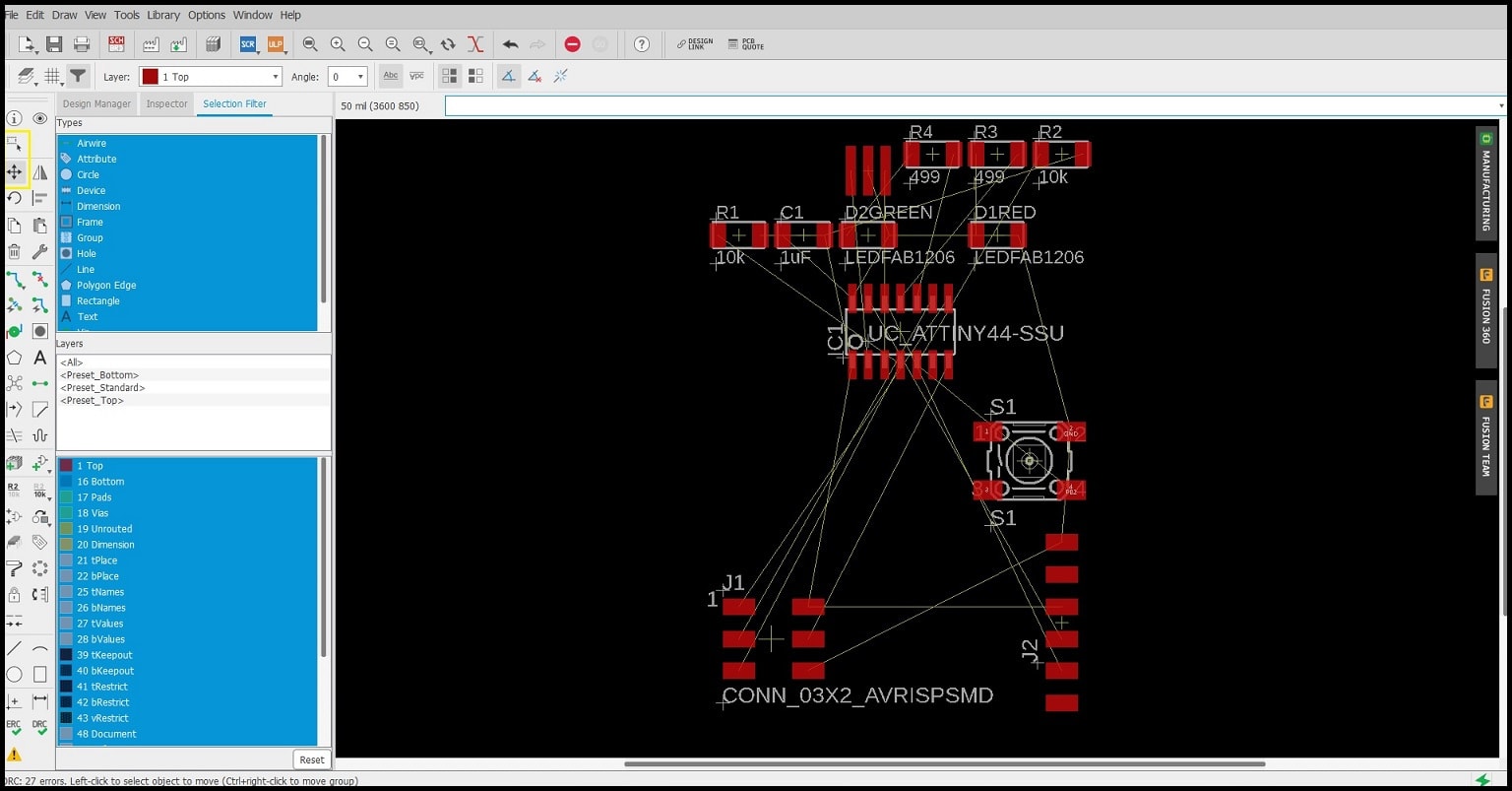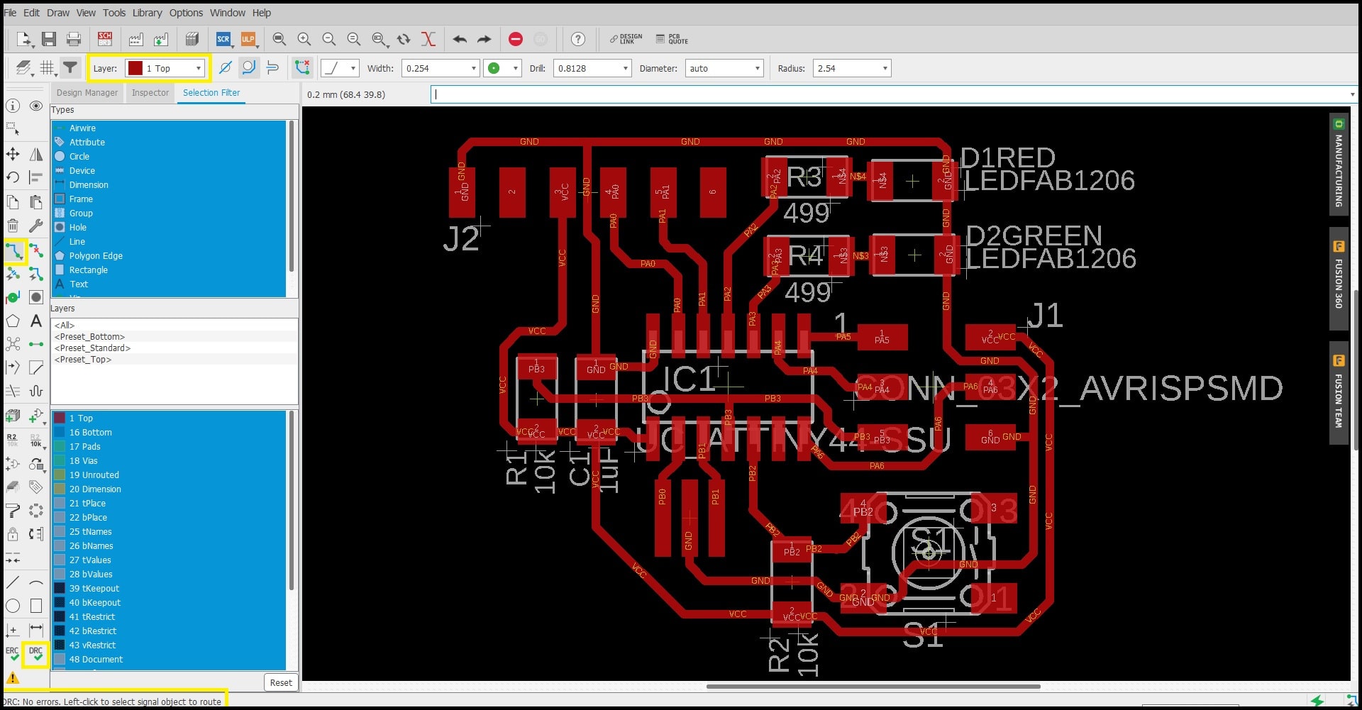 Step 3: Use “Route Airwire” tool to replace fine yellow connections and route between your components. You may take some time to find a good positioning for components. Minimum route width is defined in fabcity-designrules.dru 10 mil (0.254 mm) and also minimum spacing between routes 16 mil (0.41 mm) to fit with 1/64” milling bit. Note that all routes are part of layer “1 Top”.