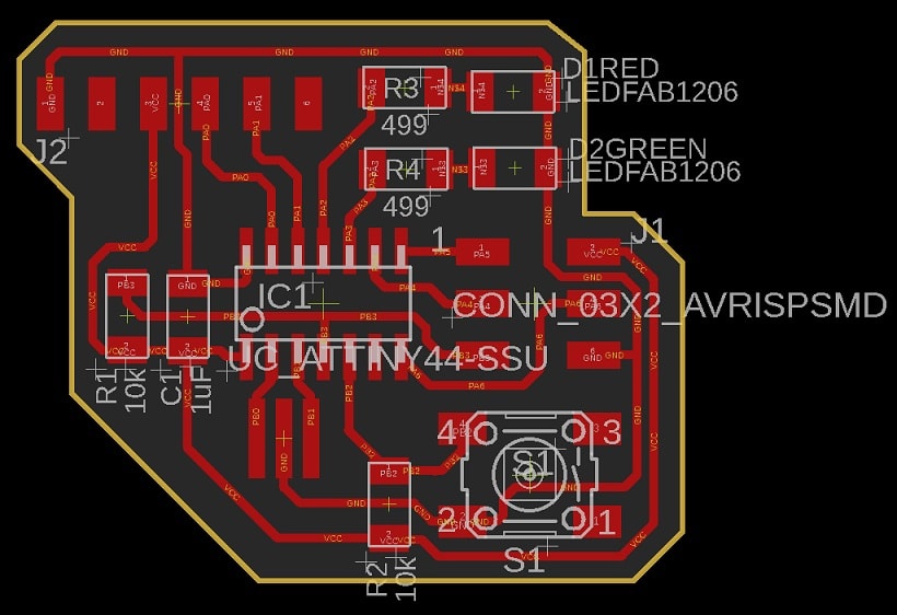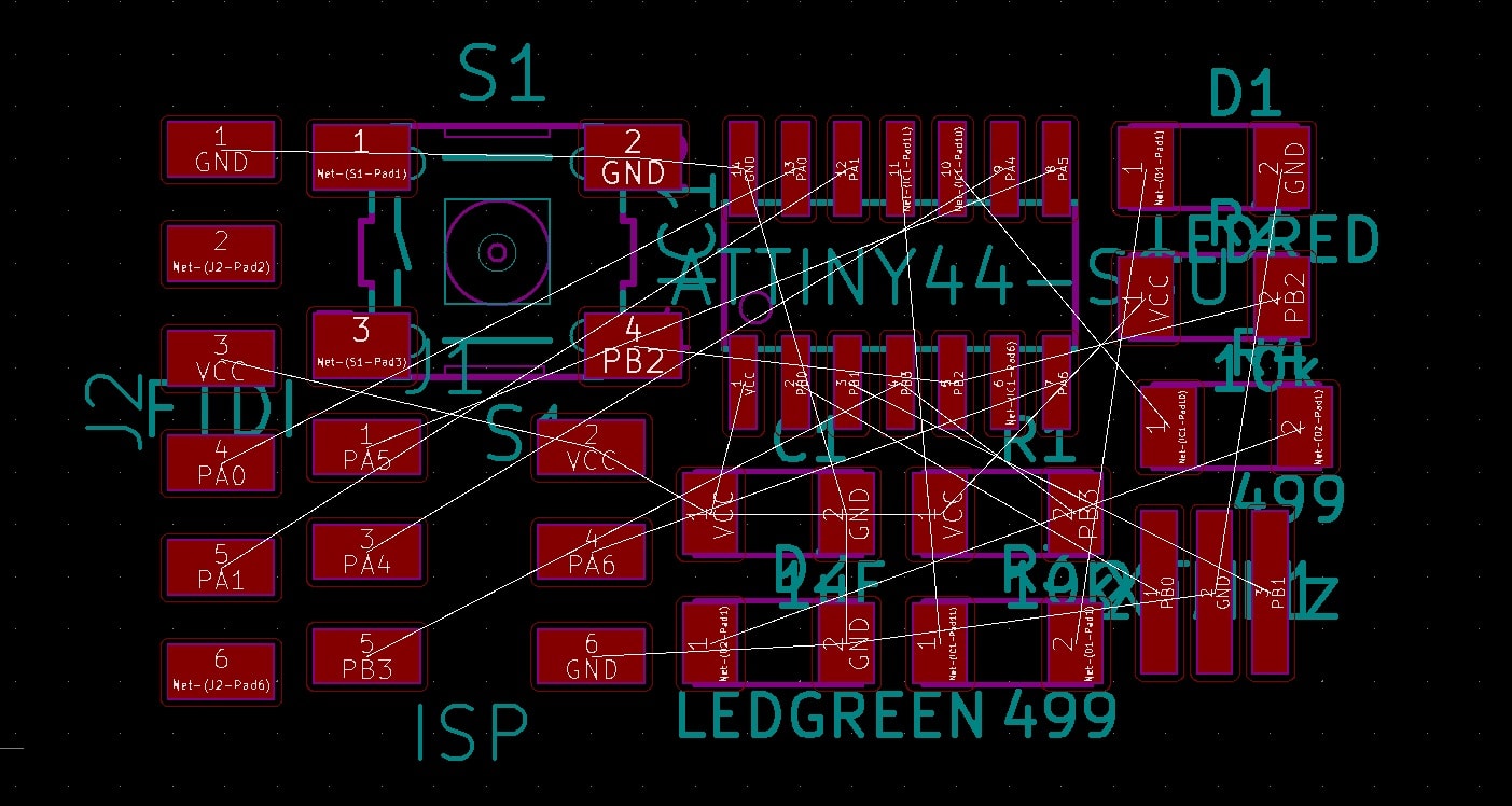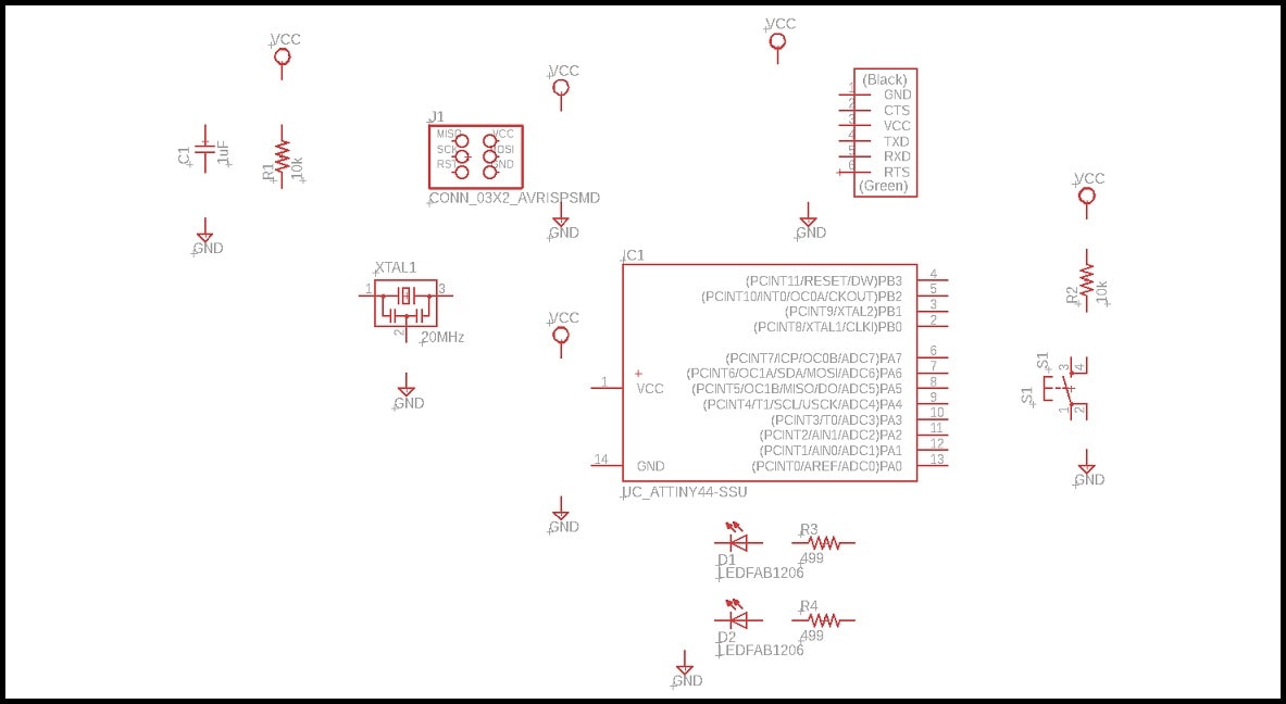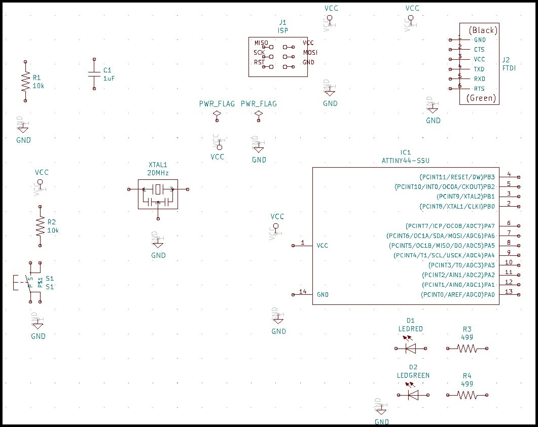 In this part I redrew the echo hello-world ATtiny44 board using Eagle and added two LEDS and a push button.