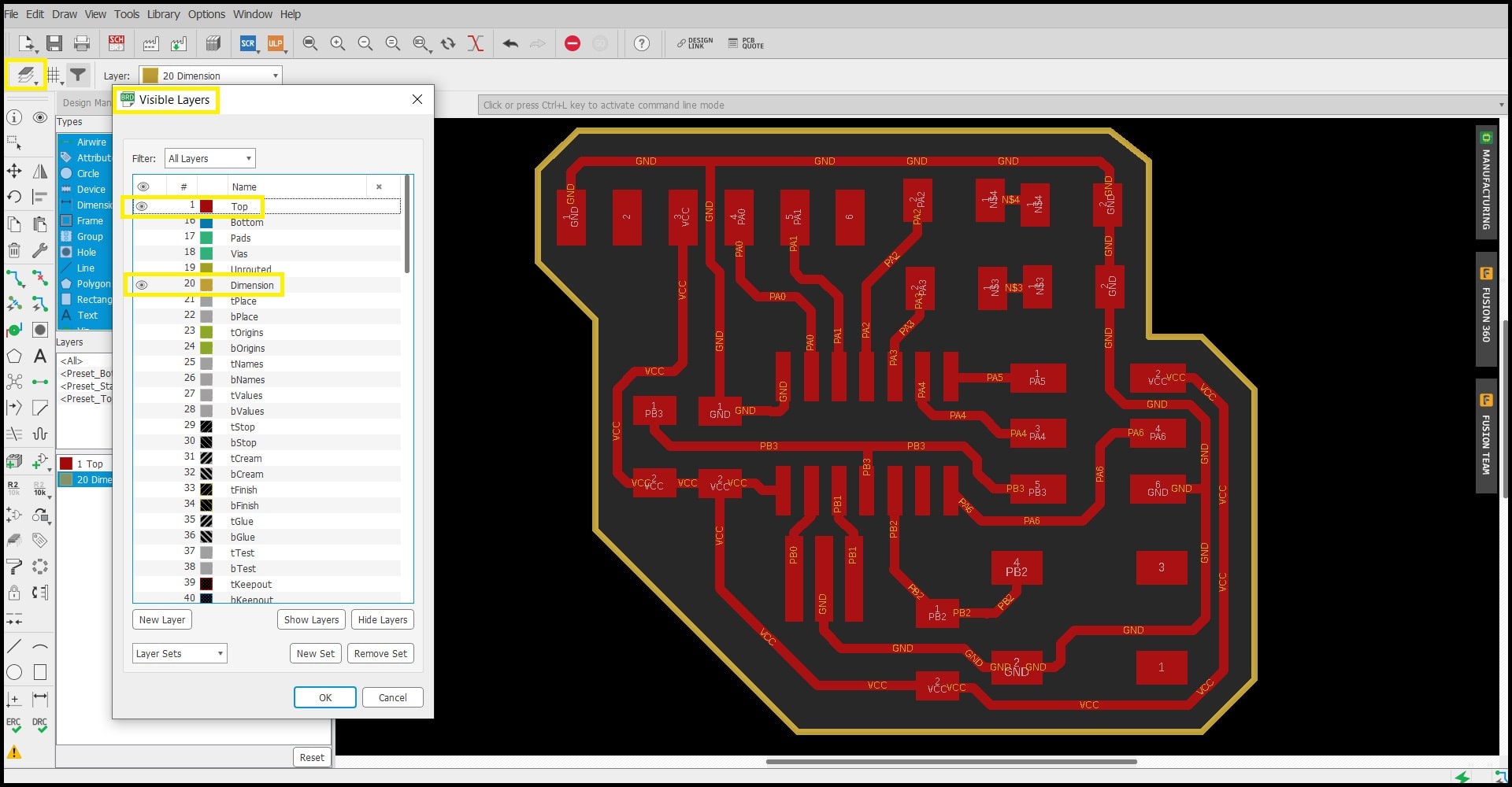 Step 5: Now we will export the traces and interiors as png files, so we can use in mods to generate the rml files for the milling machine. Go to “Layer Settings” and hide all layers by clicking on the eye icon, only keep “1 Top” and “20 Dimension”. Click “OK”.