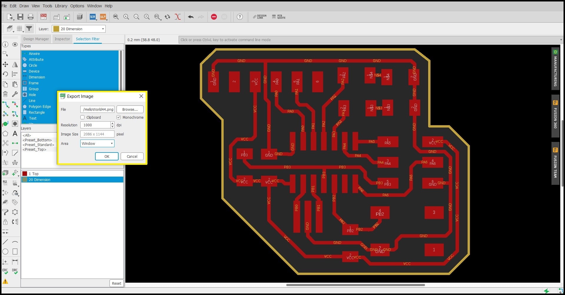 Step 6: Zoom you board to fit window. Go to “File > Export > Image”. Give your file a name, check “Monochrome”, set resolution to “1000 dpi” and set “Area” to “Window”. Click “OK”.