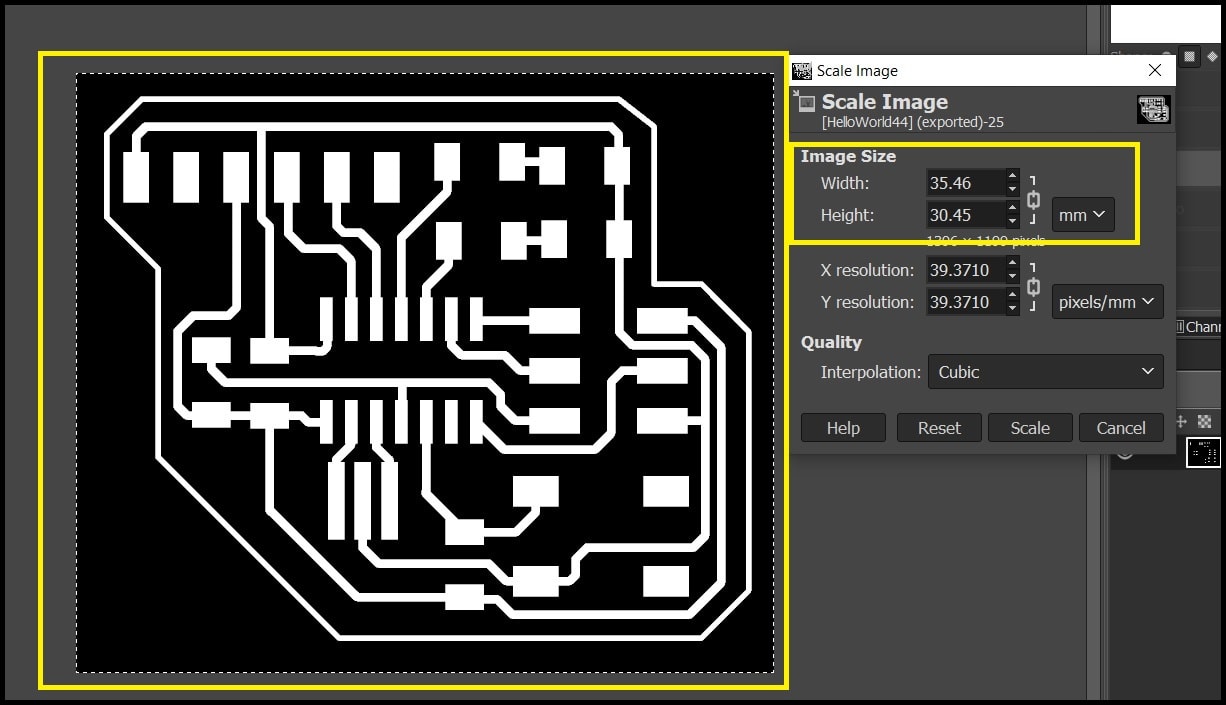 Step 10: Open the SVG file using GIMP and set “Resolution” to 1000 pixel/in. Crop the image if necessary and work to export traces and interiors. The image or cropped image dimensions are the dimensions of PCB needed to make the board.