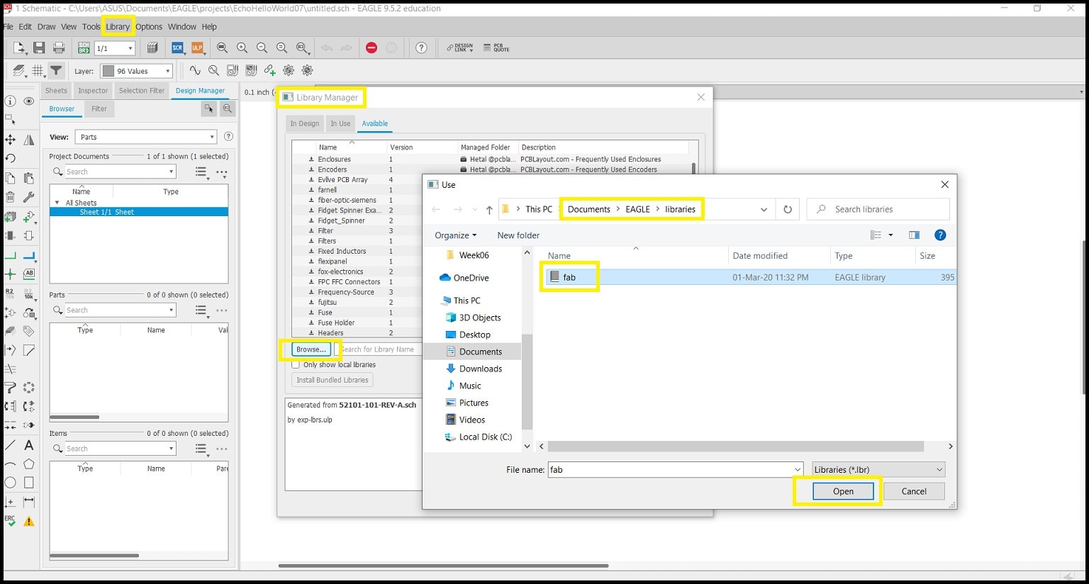 Step 3: First we will add Eagle fab library (fab.lbr). Download the file and unzip it. I unzipped it in “..\Documents\EAGLE\libraries”.