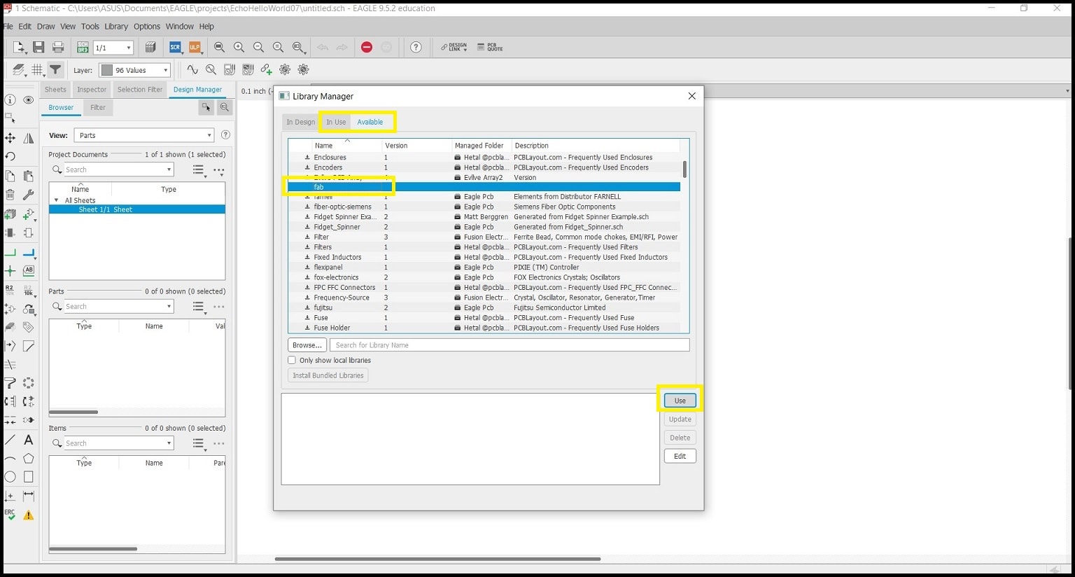 Step 4: Select fab.lbr in list and click “Use”. This will move fab.lbr to “In Use” list and make all components defined inside accessible in schematic editor. close “Library Manager”.