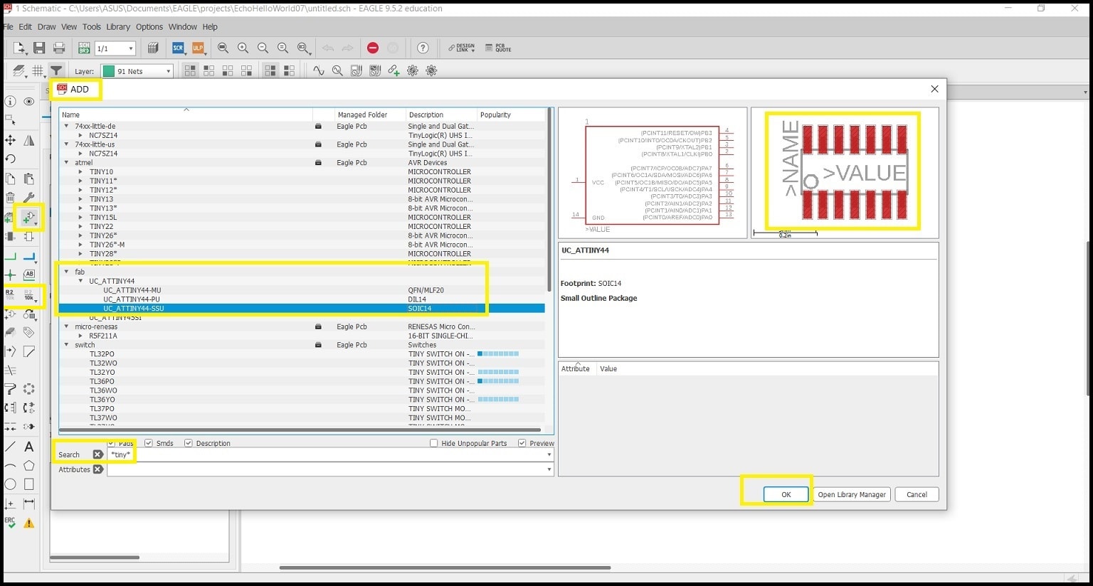 Step 5: First we will add to schematic the components of the original echo hello-world board. Click on “Add Part” and in search field look for “*tiny*“. Double click on “UC_ATTINY44” under fab library. Select “UC_ATTINY44 - SOIC14” and click “OK”. Click on schematic editor work area to place the part. Use “Name” and “Value” tools and click on “+” mark on component to change the name and value.