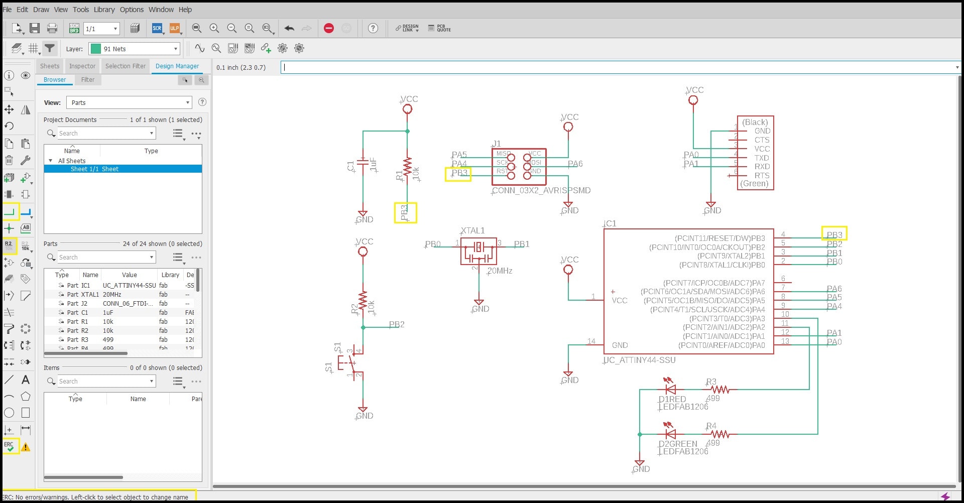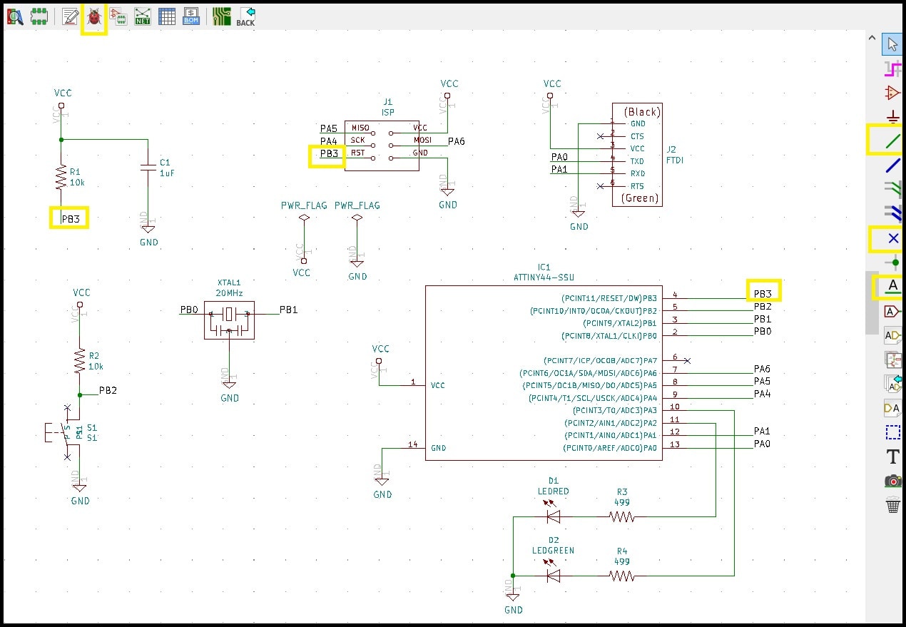 Step 7: As per the original echo hello-world ATtiny44 board and using “Place Wire” tool, add wiring to components. Make direct connections between components when possible. Using “Place net label” tool add labels to open connections. Using labels makes schematic less messy and works the same as direct connection between components. For example all open connections named “PB3” are connected together. A “Place no connection flag” should be used on pins that are not connected.