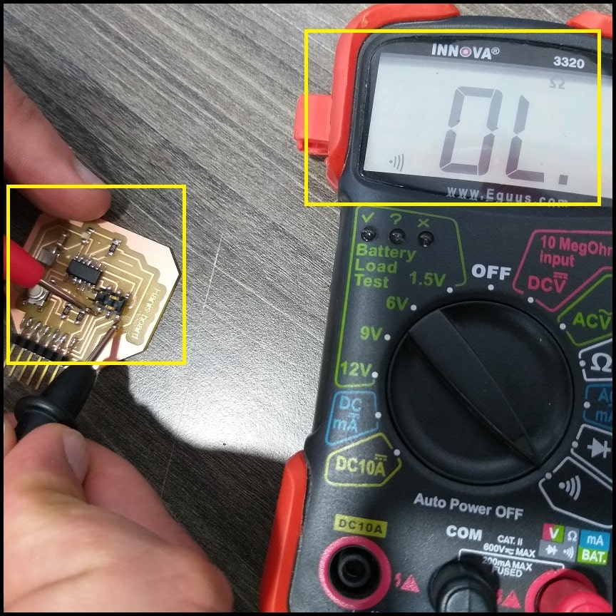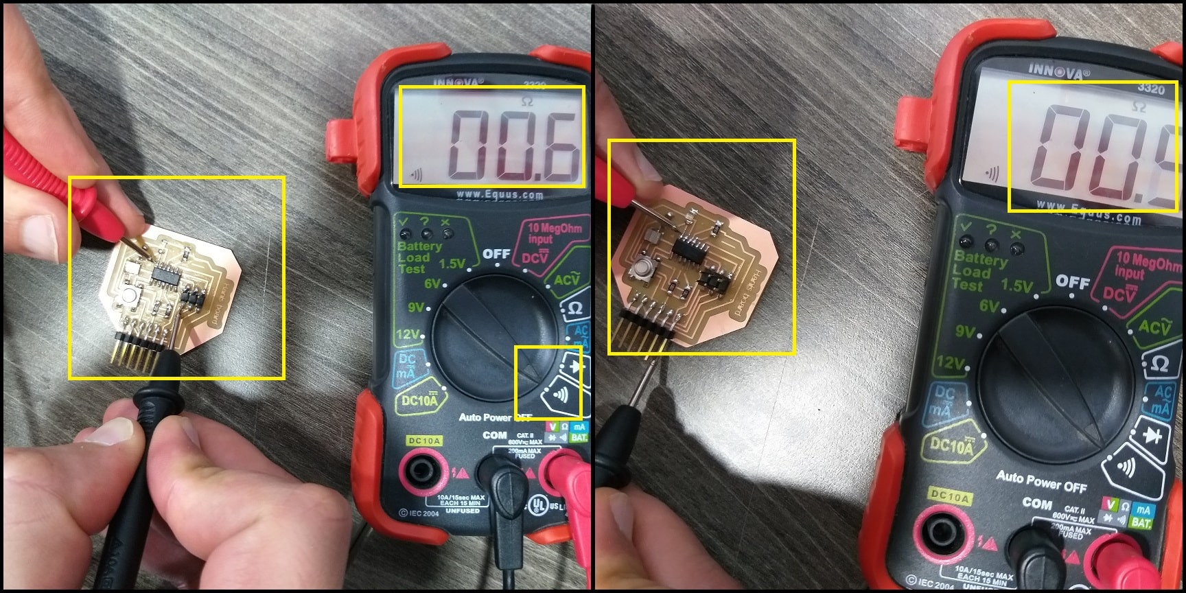 We measured the continuity between the VCC pins of the ATtiny44, SPI header and FTDI header. The digital multimeter should beep and read around 0 Ohm. This means all the three pins are connected.