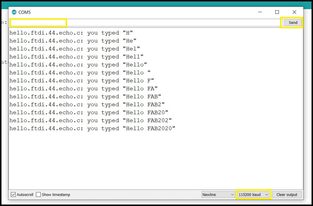 Step 6: I used “Arduino Serial Monitor” to test the program. Change the baud rate to “115200”, type a character and click “Send”. The board should echo back your input and print it back with a customized message. Input should be done character by character.