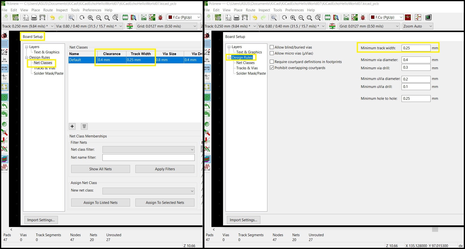 Before we start we need to define our design rules. In “Board Editor” go to “File > Board Setup”. Select “Net Classes” tab and change “Clearance = 0.41 mm” and “Track Width = 0.254 mm”. Now go to “Design Rule” tab and change “Minimum track width = 0.254 mm”. Click “Ok”.