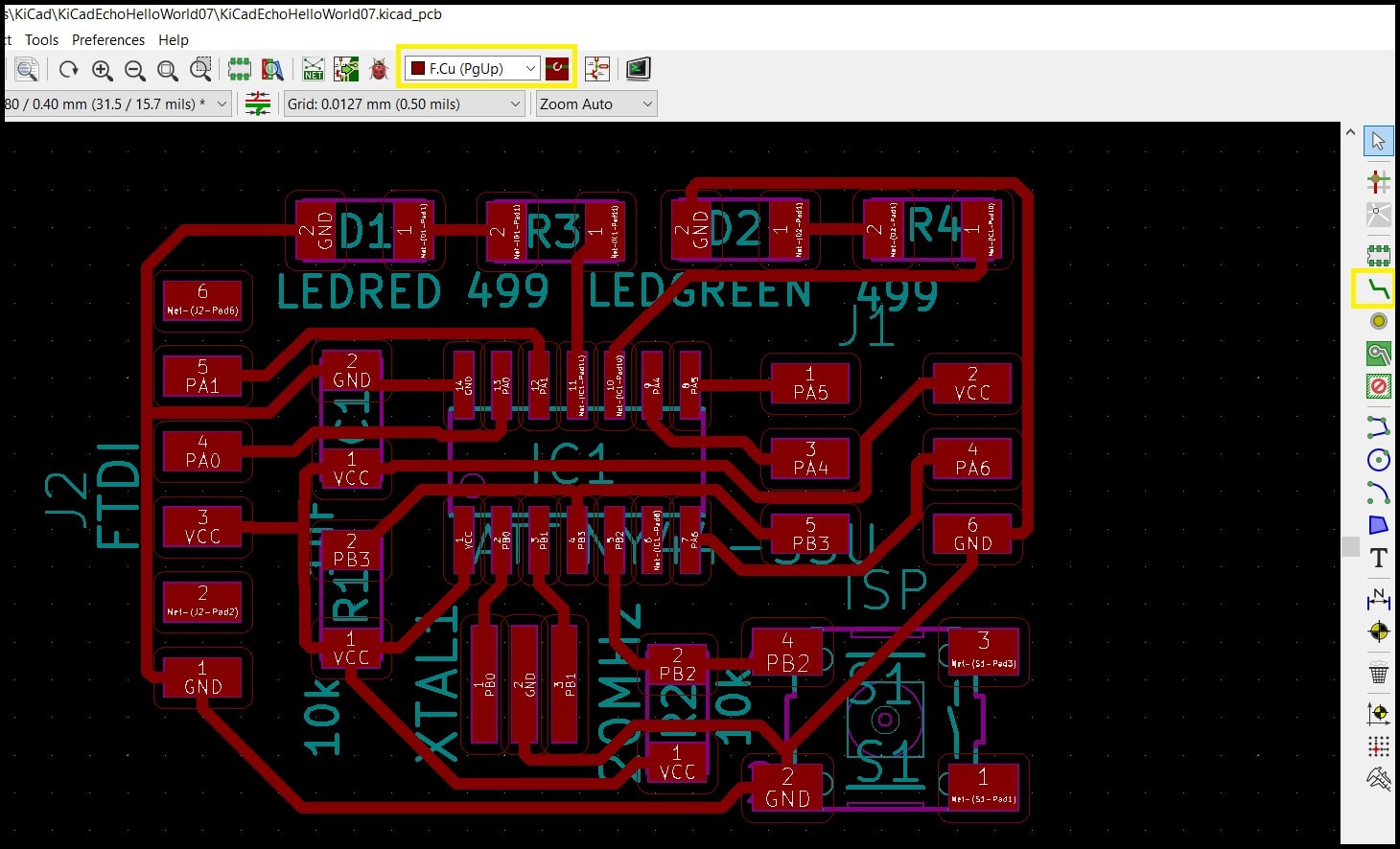 Step 7: Use “Route tracks” tool to replace fine yellow connections and route between your components. You may take some time to find a good positioning for components. Route width is defined 0.254 mm and spacing between routes 0.41 mm to fit with 1/64” milling bit. Note that all routes are part of layer “F.Cu”.